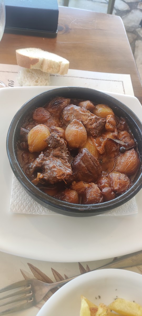 This cozy family-run taverna welcomed us warmly when we arrived for a late dinner. We were lucky enough to get a table at the edge, offering a breathtaking view of the sea—watching the blinking evening lights on other site of the see made the evening even more magical. Our drinks arrived promptly and our generously portioned dishes followed. We shared two: the **sofrito beef stew**, which was beautifully tender and rich with flavor, and the **mixed grill**, an absolute feast of perfectly cooked meats with juicy softness. I considered ordering a third dish—the **village sausages**—but after tasting a piece that was included in the mixed grill (juicy and bursting with smoky goodness ), I wasn’t sure I could survive another deliciously hearty plate! Beyond the incredible food, the staff’s friendly and lighthearted humor made the experience even more enjoyable. That added a personal touch that made us feel right at home.